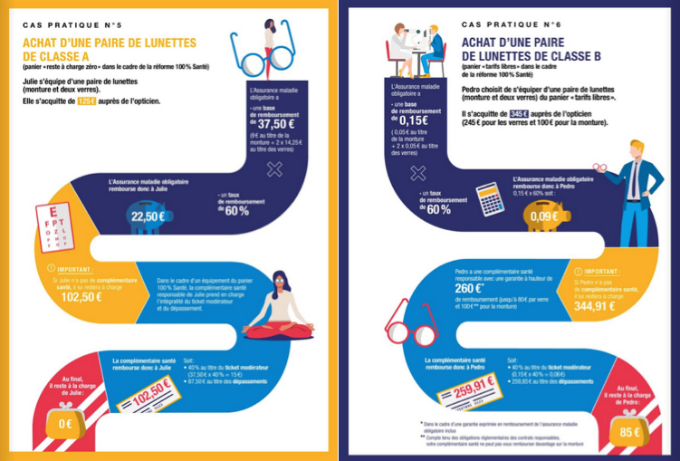 En février 2019, l’Union nationale des assurances maladie complémentaires (Unocam), la Fédération nationale de la mutualité française (FNMF), la Fédération française de l’assurance (FFA) et le Centre technique des institutions de prévoyance (CTip) avaient pris l’engagement commun, auprès d’Agnès Buzyn alors ministre de la santé, d'une meilleure lisibilité de leurs contrats. Un an plus tard, les choses tardaient encore à se concrétiser, malgré les demandes insistantes du ministère via la Direction de la Sécurité sociale… Cet été, une première initiative s'est matérialisée sous la forme d’une brochure en ligne intitulée « 6 clés pour mieux comprendre et bien choisir sa complémentaire santé ». À vocation didactique, ce document d’une vingtaine de pages, assorti d’un glossaire (qui en compte, lui, une trentaine), expose à travers des cas pratiques très concrets le fonctionnement du système de remboursements des soins, en optique et en audio notamment. Ci-dessous, à titre d’exemple, les pages portant sur l’achat d’un équipement optique…